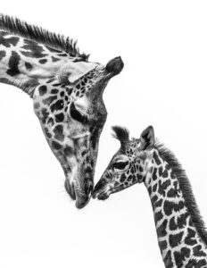 A moment of a!ection between a mother gira!e and her young. Tenderness blooms in the space between them, a mother’s silent promise of protection and love, a whispered message that transcends language.